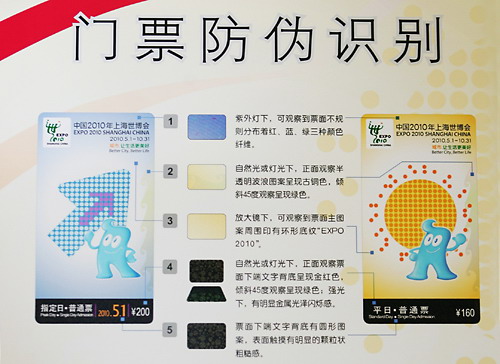 為了讓民眾放心購買,上海世博會門票在防偽方面下足功夫。購票者可通過眼看、手摸、借助紫外燈以及放大鏡等方式判斷門票真?zhèn)!吧虾J啦⿻T票采用了具有自主知識產(chǎn)權(quán)的芯片技術(shù),其最顯著的特點就是將傳統(tǒng)印刷防偽技術(shù)與電子芯片技術(shù)進行創(chuàng)新結(jié)合,具有防偽性能強、獨占性高、唯一性好、時效性長、確保安全可靠等特點。”陳先進介紹說。同時,他表示,有關(guān)部門將嚴厲打擊非法銷售世博會門票的行為,以保護廣大購票者利益。 (徐筍)