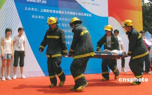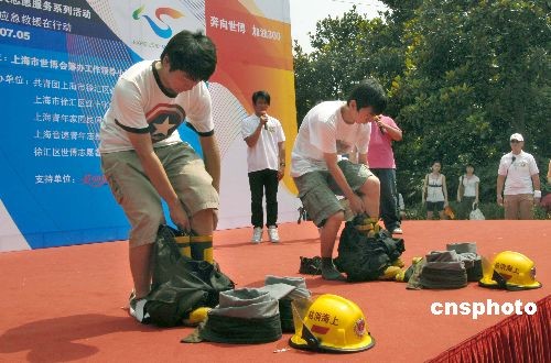 7月5日是中國(guó)2010年上海世博會(huì)倒計(jì)時(shí)300天,“我們?cè)谀闵磉叀笔啦⿻?huì)大型志愿者集中服務(wù)行動(dòng)在申城各街道社區(qū)拉開(kāi)帷幕,世博志愿者在徐家匯公園進(jìn)行模擬心肺復(fù)蘇應(yīng)急救援演示,活動(dòng)現(xiàn)場(chǎng)還有消防中隊(duì)官兵宣講高樓逃生技巧、滅火器操作方法等,旨在普及、宣傳應(yīng)急救援知識(shí),提高公眾的安全意識(shí)和應(yīng)變能力,保障世博會(huì)游客安全。中新社發(fā) 海牛 攝