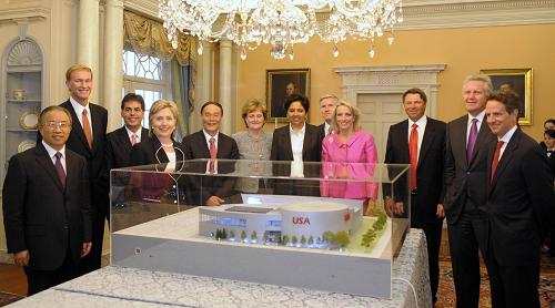 7月28日,正在華盛頓參加首輪中美戰(zhàn)略與經(jīng)濟對話的中國國家主席胡錦濤特別代表、國務(wù)院副總理王岐山和國務(wù)委員戴秉國以及美國總統(tǒng)奧巴馬特別代表、國務(wù)卿希拉里·克林頓和財政部長蒂莫西·蓋特納27日在美國國務(wù)院共同為2010年上海世界博覽會美國館模型揭幕。