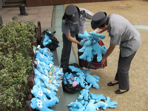 在南京路步行街管理辦牽頭下,黃浦區(qū)城市管理監(jiān)察大隊(duì)開展了對(duì)南京路步行街各類無證設(shè)攤的打擊,一天之內(nèi)就收繳了200余只假冒海寶玩具。這是城管部門在與上海世博局建立聯(lián)動(dòng)機(jī)制后,首次收繳侵犯上海世博會(huì)知識(shí)產(chǎn)權(quán)標(biāo)志的商品。