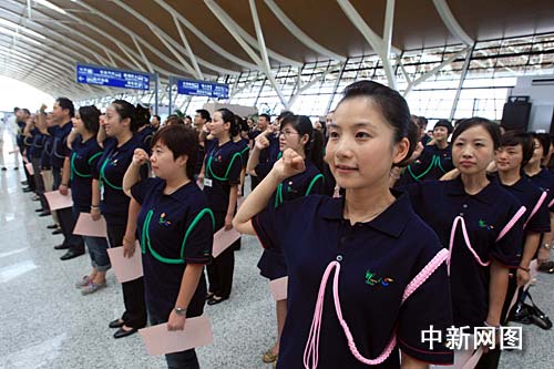 中新網(wǎng)上海9月4日電 (;萦ⅰ√K巍巍) 9月4日上午,上海機場集團在浦東機場T2航站樓舉行了上海機場世博志愿者服務總隊成立儀式,120名身著統(tǒng)一服裝的志愿者代表在9名勞模的帶領下莊嚴宣誓,“我志愿成為一名光榮的上海機場世博志愿者。我承諾:盡已所能,不計報酬,幫助他人,服務社會。”上海機場集團副總裁、上海機場世博志愿者服務總隊第一副總隊長朱寧一向4支志愿者服務隊授牌。