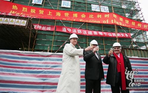 自破土動工之日起僅三個月時間,位于上海世博園區(qū)C片區(qū)的比利時—歐盟館便宣告結構封頂。昨天下午,比利時—歐盟館舉行結構封頂儀式,歐盟駐華大使、上海世博會歐盟館總代表賽日安博和上海世博會比利時展館總代表戴明哲與來自歐盟和比利時的官員,一起見證了展館建設進程中這一具有里程碑意義的時刻,安博也首次介紹了歐盟展區(qū)的展示方案。