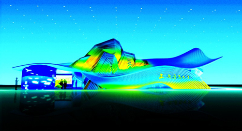記者在現(xiàn)場看到,盡管尚需細(xì)化,但剛剛誕生的山東館已顯示出不凡魅力。展館占地600平方米,最高處約9米,以藍(lán)色為主色調(diào),突破了以往展館四墻合圍的方正常規(guī),外觀將大海的浪涌和雄峙的泰山融為一體,流暢的曲線勾勒出山東“海岱交融”的地理形勝,表達(dá)出“青山連綿不絕,綠水長流不斷”的文化意境。