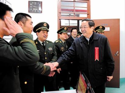 俞正聲和丁薛祥、陳豪、胡延照、王新奎、張學(xué)兵等來到武警上海市總隊世博安保任務(wù)部隊某部,實地察看值班室,聽取園區(qū)安保情況介紹;走進部隊營房,與武警戰(zhàn)士親切交談,了解戰(zhàn)士們的訓(xùn)練、生活情況。聽到戰(zhàn)士們對生活保障表示滿意,俞正聲十分高興,他說:“春節(jié)即將來臨,請向你們的家人問好。今年迎辦世博的任務(wù)很繁重,相信通過大家的共同努力,我們一定能實現(xiàn)平安世博的目標。”戰(zhàn)士們鏗鏘作答:“為世博爭光彩,為祖國作奉獻,永遠做黨和人民的忠誠衛(wèi)士!