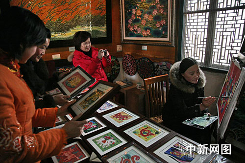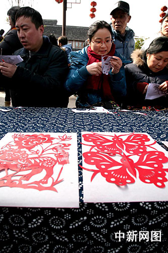 中新網(wǎng)上海2月18日電 在上海金山著名文化古鎮(zhèn)楓涇,一場由金山農(nóng)民畫家和游客共同參與的繪世博題材農(nóng)民畫、剪世博窗花PK賽,17日在位于該鎮(zhèn)中國農(nóng)民畫村和古戲臺舉行。