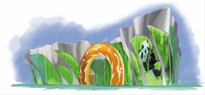 進(jìn)入拱門(mén),參觀者將遇見(jiàn)歡迎八方來(lái)賓的大熊貓“歡歡”。通過(guò)多媒體播放,這位迎賓者傳遞出四川人民的熱情。 “歡歡”也是人們整個(gè)參觀過(guò)程中的導(dǎo)游,會(huì)在各個(gè)展區(qū)的多媒體視頻上出現(xiàn)。
