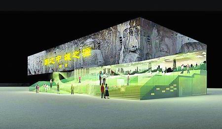 河南館的建筑外形由一個“中”字變形而來,分上中下三層空間,其中中部構(gòu)成一個全開放的坡面空間,為展館主體,上層主要是穹頂裝置,下層則設(shè)計為一個藏寶室。正面是“國之中、城之源”及“河南”幾個大字;側(cè)面,盧舍那大佛微笑了千年的龍門石窟,觀之令人震撼。展館主體空間,由數(shù)千個文物復(fù)制品、人物模型組成了一個實(shí)體的、起伏綿延的游行隊(duì)伍,仿佛是一場流暢的盛大演出。據(jù)了解,上海世博會河南館正在加緊裝修布展,各種展品正陸續(xù)運(yùn)往上海,參展文物和大游行人偶4月10日~15日安放到位,4月15日~20日試運(yùn)行,4月20日后將隨中國館試運(yùn)營。昨天,河南世博辦還向記者解讀了河南館的五大亮點(diǎn)。