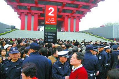 上午10點(diǎn),由于人流過于擁擠,亞洲廣場(chǎng)旁的預(yù)約點(diǎn)預(yù)約機(jī)陷入癱瘓,全面停止了預(yù)約。工作人員在現(xiàn)場(chǎng)用擴(kuò)音機(jī)與排隊(duì)的參觀者隔空喊話,大約10多分鐘后,人潮漸漸散去。對(duì)于這個(gè)突發(fā)的情況,預(yù)約點(diǎn)的工作人員表示,希望參觀者可以自行分流,雖然有些預(yù)約點(diǎn)的地理位置離中國(guó)館相對(duì)較遠(yuǎn),但每張預(yù)約券都預(yù)留了至少1個(gè)小時(shí)的提前量,如果9點(diǎn)打印的預(yù)約券,上面的預(yù)約時(shí)間至少是10點(diǎn)以后,因此,無論在展區(qū)的任何一個(gè)預(yù)約點(diǎn)預(yù)約,走到中國(guó)館參觀都是來得及的。