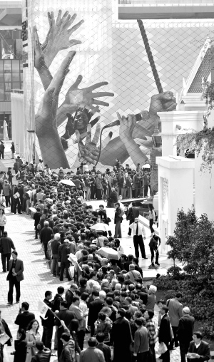 拿到中國館預(yù)約券的游客欣喜,沒拿到的也十分平和。錢先生夫婦9時(shí)45分入園時(shí),中國館預(yù)約券已發(fā)放完畢,他們就在亞洲廣場上的預(yù)約機(jī)上預(yù)約了主題館的參觀!爸袊^反正是永久性建筑,以后再來看也不遲,”同樣未能拿到預(yù)約券的李先生告訴記者。