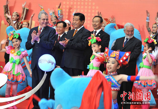 致辭完畢,賈慶林與讓·皮埃爾·藍峰共同啟動開園按鈕,象征性地開啟了2010年上海世博會的大門。按鈕啟動后,前方一個裝置設備上的圓環(huán)慢慢圍繞一把“金鑰匙”旋轉起來,形如一個地球儀,效果令人印象深刻。