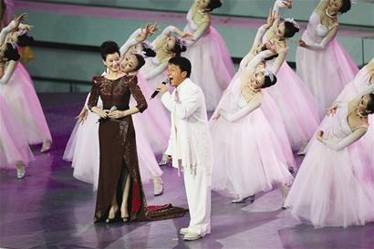 約半個(gè)小時(shí)的開幕式演出,聚合了五大洲的頂級(jí)明星,星光璀璨照耀浦江。在嘉賓入場(chǎng)后,由上海大學(xué)生組成的800人合唱團(tuán)唱起一曲《和諧歡歌》,“鮮花簇?fù)砑s定地方,熟悉沒見過的臉龐,呼喚聽見心靈激蕩,邀世界分享……”著名歌唱家宋祖英和國(guó)際巨星成龍攜手出場(chǎng),為本次世博會(huì)開幕唱響第一個(gè)強(qiáng)音。