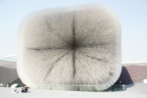 記者:我現(xiàn)在就在英國館外大概50米左右的地方,英國館占地6千平方米,是最大的自建館之一,在英國館的入口處外墻上印了這么一句話,“英國館就是英國送給中國的禮物”。為什么這么說呢,因為整座的英國館的外墻就像一個剛剛打開的精致禮品包裝盒,種子圣殿就是禮物本身,在外面的露天廣場則是剛剛?cè)¢_的包裝紙,游客們可以在上面休息,孩子們可以在上面嬉戲。