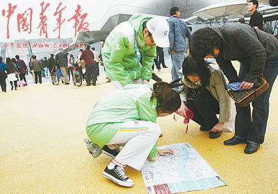 中國館南廣場上的30名首批志愿者都是來自復(fù)旦大學(xué)的學(xué)生。他們的工作在很多人看來很簡單,就是疏導(dǎo)游客,給游客指路。他們每天要重復(fù)幾萬次的回答就是:“對不起,預(yù)約券已經(jīng)發(fā)完了”,“您好,請往這邊走”……“現(xiàn)在我已經(jīng)不用看地圖就能清楚地給游客指路了。以前還不熟悉的時候,我利用休息的時間不斷地看地圖,已經(jīng)翻爛了兩份地圖,這是第三份了!卞X琲從包里翻開她的園區(qū)地圖,這一份也已經(jīng)快被她翻爛了,快斷裂的地方她用透明膠布粘著。