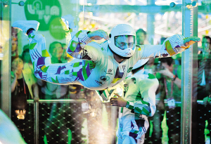 在展館樓上,有一個(gè)8米高的“玻璃房子”,一鼓風(fēng),玻璃房?jī)?nèi)的人可以飛起來(lái),風(fēng)洞的風(fēng)速可以在瞬間達(dá)到20公里/小時(shí),穩(wěn)穩(wěn)托舉住“飛人”。在昨天開(kāi)館儀式后,拉脫維亞總理東布羅夫斯基斯身穿“飛翔服”,戴上頭盔,親身體驗(yàn)了一回當(dāng)空中飛人的感覺(jué),將現(xiàn)場(chǎng)氣氛推向高潮。