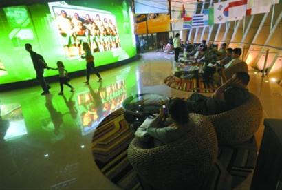 在館內(nèi),兩塊3D投影大屏幕已經(jīng)就位,讓游客可以看到身臨其境的3D世界杯直播,其信號來自南非的電視臺。今晚,這塊屏幕會(huì)高清直播開幕式和首場比賽。而在“球吧”門口,便是世界杯倒計(jì)時(shí)碑,一分一秒地計(jì)算著距離世界杯到來還有多少時(shí)間。