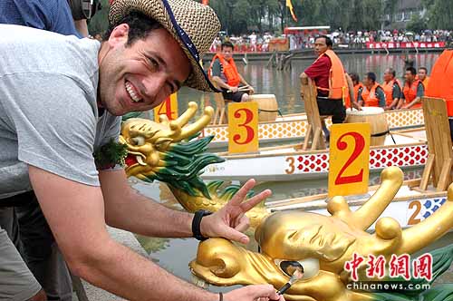 隨著裁判的一聲令下,龍舟賽開賽,現(xiàn)場陣陣歡呼加油聲。第一次到中國,看到這種比賽,Tomas好奇地頻頻按下快門。一邊看著15支隊(duì)伍的激烈爭奪競,一邊詢問著記者關(guān)于這項(xiàng)中國傳統(tǒng)民俗的由來和剛剛給龍“點(diǎn)睛”的典故,聽完記者的解釋后,Tomas贊嘆不斷:“太有意思了!”