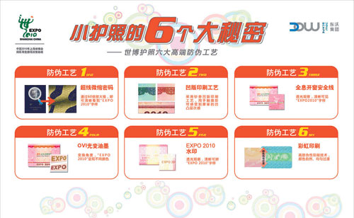 此外,記者了解到,改版后的世博護照還加強了防偽技術(shù)。據(jù)悉,改版《世博護照》各款產(chǎn)品封面的燙金世博Logo內(nèi)均采用了超線微縮密碼防偽技術(shù),采用60倍的放大鏡觀看,則可清晰看到EXPO2010字樣。這一通常只用于鈔券的高端防偽技術(shù)被運用,標志著世博護照的防偽技術(shù)又上一個新臺階,同時也再次提升了世博護照的珍藏價值。