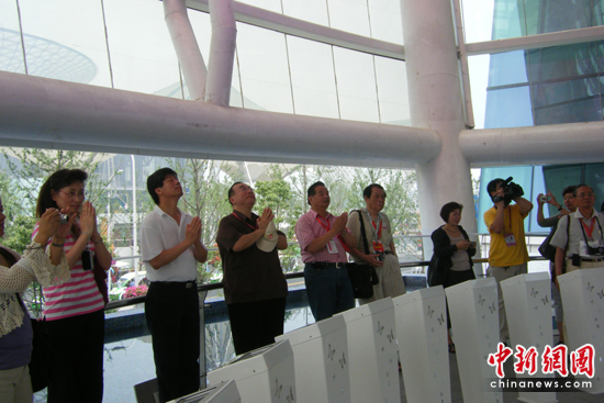 僑界人士隨后在臺灣館內(nèi)的LED點燈水臺共同祈福,希望中華民族能夠團(tuán)結(jié)和睦,人民生活安定。