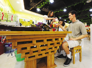 茶文化園內(nèi)20個展臺前,均設(shè)有供賓客免費品茗、觀賞中華茶藝的休閑區(qū),客人們在此休憩、品茗的同時,也被繽紛多彩、香味濃郁的各色中華名茶深深吸引,許多人往往會情不自禁地掏錢買幾份包裝考究、有世博會標識圖案的禮品茶饋贈給親友。比利時籍華人游客翁先生是食品采購商,他逐一品嘗了味道不一的帝芙特伯爵紅茶、薄荷茶、芙蓉茶、綠怡茶,對這些印有海寶和各國展館圖案的金字塔形茶葉包裝盒很感興趣,認為很有藝術(shù)感,要帶到比利時,讓大家品嘗一番中國佳茗,為此他一下子就訂購了3500份這種造型的禮品茶。據(jù)悉,光顧茶文化園的賓客中,近30%來自美國、加拿大、德國、新加坡、日本、韓國、尼泊爾等國家,世博茶文化園已成為外國賓客了解中國茶文化的一個窗口。(江躍中 顧武)
