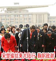 ·宋楚瑜家鄉(xiāng)先祖墓葬完好如初 祭祖儀式共分九步 ·家鄉(xiāng)湘潭市五星酒店為宋楚瑜營(yíng)造“回家”氛圍 ·宋楚瑜深夜會(huì)見劉銘傳后代欣然稱當(dāng)“名譽(yù)顧問” · 選"主席"棄"總統(tǒng)" 宋楚瑜下榻酒店突出瀟湘特色 ·花絮:南京中山陵市民、游客與記者“搶”鏡頭 ·宋楚瑜攜42件琉璃贈(zèng)大陸 與連戰(zhàn)均選王俠軍作品 · 圖文:劉曼君講述宋楚瑜家族在大陸的一張全家福