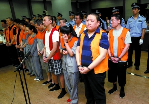 胡毅(前排右一)等18名被告人被帶上法庭。昨日,騙取北京農(nóng)商行7.08億貸款的嫌疑人庭上受審。本報記者 王貴彬 攝