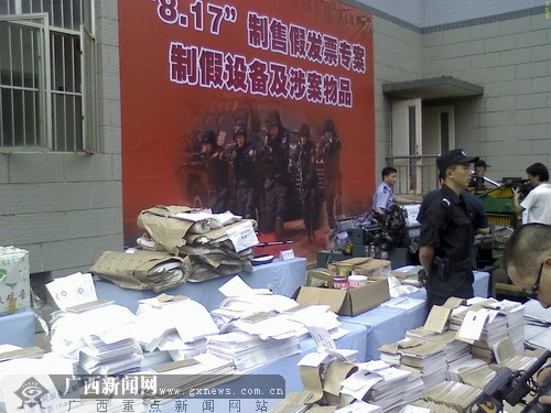 南寧市公安局11日向社會披露,7月7日,在(廣西)自治區(qū)公安廳的領導和指揮下,該局成功破獲了公安部督辦的以曾某為首的非法制造出售假發(fā)票犯罪團伙的特大案件(簡稱“8.17”專案)。搗毀大型假發(fā)票印制窩點1個、假發(fā)票藏匿窩點1個,抓獲涉案人員10人,繳獲假發(fā)票82.94萬份,累計票面金額53.3億元,涉稅金額2.46億元;印制假發(fā)票的機器設備4臺、模版、底片、印章、紙張、油墨等制假材料一批。這是目前為止廣西累計票面金額最大的假發(fā)票案。