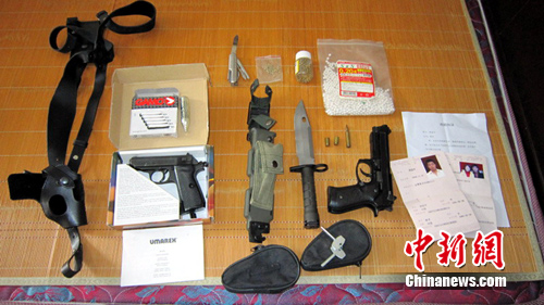 7月9日上午,義烏市公安局刑偵大隊技術(shù)員前往犯罪嫌疑人胡益華在金華的住處進行進一步調(diào)查時,從該處搜出仿真槍兩支、軍用子彈一顆、彈殼兩枚、銅子彈及塑料子彈若干、軍用匕首一把、槍套一副、手銬鑰匙兩個等違禁物品。