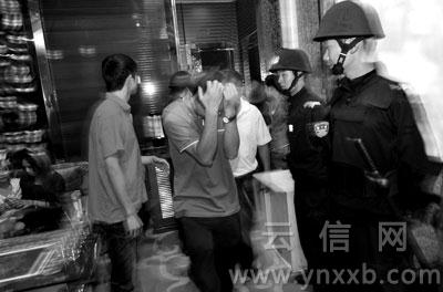 “緊急通知,今晚九點(diǎn)半在分局集中,參加統(tǒng)一行動(dòng)。”晚21時(shí)左右,官渡公安分局治安大隊(duì)民警們突然接到了臨時(shí)通知。22時(shí),內(nèi)線發(fā)出信號(hào),警車開往珥季路某娛樂會(huì)所。當(dāng)50多名全副武裝的警察沖進(jìn)該娛樂場(chǎng)所時(shí),訓(xùn)練有素的迎賓們并沒有慌亂,漂亮的姑娘們依舊招牌式笑著:“歡迎光臨”。