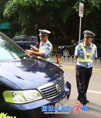 據(jù)在現(xiàn)場的市民李先生介紹,昨日上午,他和朋友開車到古玩一條街閑逛,可因前方堵車,一直無法進入,李先生隨即下車走到路口發(fā)現(xiàn),原來有兩輛軍車和一輛省政府公務車違規(guī)在路邊停車,導致交通堵塞。就在車主們焦急等待的時候,?诮痪皶r趕來,疏導了現(xiàn)場的交通后,毫不猶豫地對這些違規(guī)停車的“特權(quán)車”及其他私家車開出罰單。(國際旅游島商報 記者王煥娟特約記者李順成攝影報道)