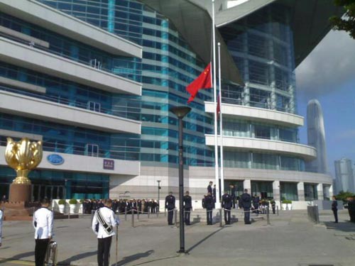 特區(qū)政府在灣仔金紫荊廣場舉行升旗及下半旗儀式,并為馬尼拉挾持人質(zhì)事件中的死難者,默哀三分鐘。約500名市民參與儀式,部分人感觸落淚。