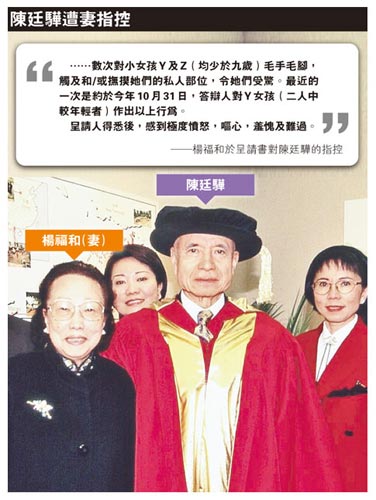 在楊福和控告次女之前,原來(lái)早于去年12月9日已向家事法庭提出離婚呈請(qǐng)。楊福和當(dāng)時(shí)向法庭提出,丈夫于2004至2005年期間,曾經(jīng)作出不合理行為(unreasonable behaviour),二人不能再共同生活。到今年10月2日,楊福和向法庭呈交補(bǔ)充資料,指陳廷驊曾經(jīng)對(duì)身邊傭人及護(hù)士作出不當(dāng)行為,令她憶起丈夫過(guò)去曾經(jīng)不忠,楊福和更透過(guò)律師稱,陳廷驊曾摸兩名年僅8歲及5歲的曾孫女,楊感到羞恥,稱不能接受有關(guān)行為。