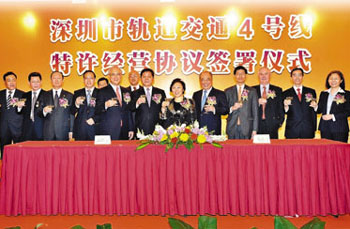 深圳市長(zhǎng)許宗衡、深圳市常務(wù)副市長(zhǎng)許勤、副市長(zhǎng)張思平與香港運(yùn)輸及房屋局局長(zhǎng)鄭汝樺、香港鐵路公司主席錢果豐等出席了簽約儀式。許宗衡表示,引進(jìn)港鐵興建深圳軌道4號(hào)線的建設(shè)并授權(quán)運(yùn)營(yíng),具有歷史里程碑的意義。