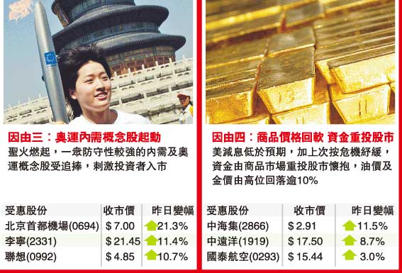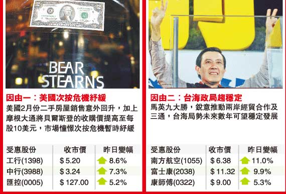 國指方面更跑贏恒指升幅6.43%,收市升890點或8.22%,收報11727點,建行、工行及中壽均升近9%,三股已推高國指逾300點。值得留意的是,除次按危機舒緩令內(nèi)地及本地金融股做好外,銳意推動兩岸經(jīng)貿(mào)的馬英九大勝,以及奧運進入圣火傳遞的最后階段,令“三通”及奧運概念股頓成追捧對象,個別股份勁升逾20%。
