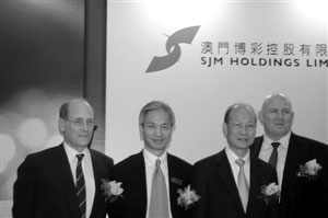 澳門(mén)博彩控股行政總裁蘇樹(shù)輝、營(yíng)運(yùn)總裁吳志誠(chéng)、業(yè)務(wù)發(fā)展總裁麥輝霆、財(cái)務(wù)總監(jiān)麥文彬25日在香港香格里拉酒店介紹上市程序。