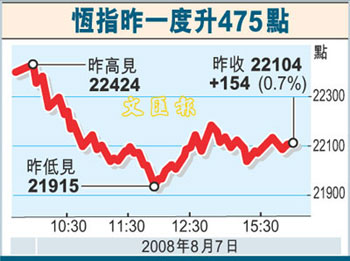 輝立資產(chǎn)管理策略師陳煜強(qiáng)表示,由于全球經(jīng)濟(jì)放緩,股市仍未見可突破的機(jī)會,加上預(yù)期奧運(yùn)期間,內(nèi)地不會有新措施出臺,估計(jì)恒指短期內(nèi)只會在22000點(diǎn)左右徘徊。