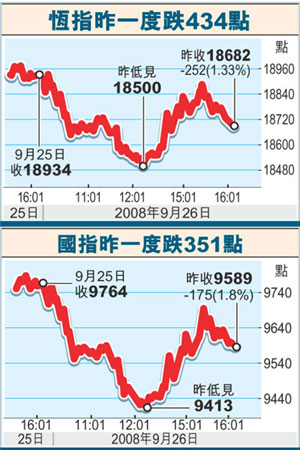 富昌證券總經(jīng)理藺常念表示,美國仍未通過救市方案,中移動母公司又被國資委抽走500億元人民幣,令市場失去信心,令中移動26日急跌3%。他形容,投資者目前對后市悲觀,紛紛不計價格地出貨套現(xiàn),就算內(nèi)地股市跌勢喘定,但美股走勢疲弱下,港股后市絕不樂觀,所以他預計,大市下周將逐步回落至18000點水平。