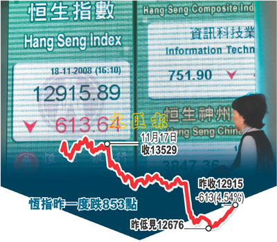 美國就業(yè)市場憂慮加深,美股跌223點,令18日外圍股市也全線偏軟,連內(nèi)地上海A股也要急挫6.3%,港股低開231點后持續(xù)下跌,下午恒指隨A股弱勢曾經(jīng)跌超過850點,低見12676點,尾市跌幅略為收窄,但仍守不住13000點大關(guān),恒指全日收12915.8點,跌613.6點,成交448億元。