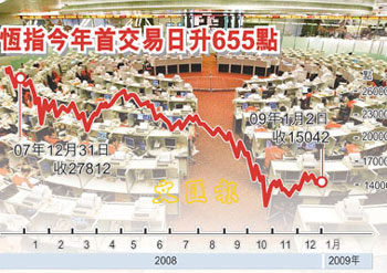 中新網(wǎng)1月5日電 據(jù)香港《文匯報》報道,溫家寶總理在元旦日跟大家打氣,中央再推“雙十規(guī)劃”促進經(jīng)濟,受惠股份如中資金融股、內(nèi)需股、汽車股及家電股均被市場看高一線,加上受3G發(fā)牌刺激的電訊股,及“松綁”的內(nèi)房股,預計5日復市的A股及港股將受惠利好消息而向好。