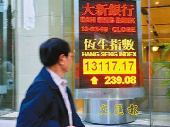 中新網(wǎng)3月19日電 據(jù)香港《文匯報(bào)》報(bào)道,受到外圍金融股造好,港股18日隨美股高開175點(diǎn),匯控連升7天,重上42元,帶動(dòng)恒指重上13000點(diǎn),大市全日升239點(diǎn)或1.86%,收?qǐng)?bào)13117點(diǎn)。國(guó)企指數(shù)升124點(diǎn),報(bào)7632點(diǎn)。不過,大市成交縮減至375億元;期指收?qǐng)?bào)13113點(diǎn),升289點(diǎn),比現(xiàn)貨低水4點(diǎn),成交65441張。
