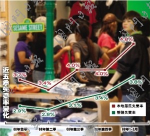中新網(wǎng)5月5日電 《澳門日?qǐng)?bào)》今日在頭條刊發(fā)報(bào)道稱,金融海嘯對(duì)澳門就業(yè)市場(chǎng)的沖擊漸顯。統(tǒng)計(jì)局?jǐn)?shù)據(jù)顯示,最新一期就業(yè)調(diào)查(今年1至3月)的失業(yè)率較上期(2008年12月至今年2月)上升0.2%,達(dá)3.8%,重上2006年中水平,就業(yè)不足率上升0.1%,達(dá)至1.8%。