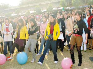 “女士射門男士守門,女士碰到有感覺(jué)的就把球踢進(jìn)去,男士若不喜歡的就把球擋在外面。”在場(chǎng)館一側(cè)的場(chǎng)地上,裁判員已經(jīng)開(kāi)始大聲宣布著比賽規(guī)則。哨音一響,女士們奮力地把球踢向自己中意的“球門”。有一個(gè)女孩看上一個(gè)戴眼鏡的男生,把球朝他踢過(guò)去,由于用力過(guò)大,反而一下將他給踢倒了,引來(lái)了現(xiàn)場(chǎng)一片笑聲。