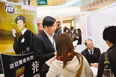 泛亞警衛(wèi)4日提供80個(gè)保安員職位,該公司培訓(xùn)經(jīng)理曾沛焜表示,為留住人才,集團(tuán)旗下保安員今年的薪酬較去年上升5至10%,以高級(jí)大堂經(jīng)理為例,月薪由去年的10500元上升至11500元,“英語普通話是基本要求,也要懂得急救技術(shù)”。