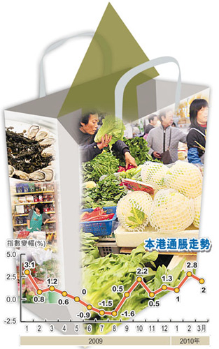 統(tǒng)計(jì)處昨日公布,3月份綜合消費(fèi)物價(jià)指數(shù)按年上升2%,較2月份的2.8%為低,但由于2月份為農(nóng)歷新年消費(fèi)旺季,因此若將今年首兩個(gè)月的物價(jià)指數(shù)合并計(jì)算,按年升幅為1.9%,故3月份物價(jià)仍有0.1個(gè)百分點(diǎn)的升幅。數(shù)字亦顯示,今年首季綜合消費(fèi)物價(jià)指數(shù)按年上升1.9%。