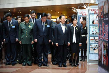 12日下午2時(shí)28分,香港文化中心一片肅穆。在參觀“蜀港同心大愛無疆──汶川大地震一周年紀(jì)念圖片展”后,曾蔭權(quán)與高祀仁連同駐港部隊(duì)司令員張仕波少將、中聯(lián)辦副主任李剛、外交部駐港副特派員詹永新、政制及內(nèi)地事務(wù)局局長(zhǎng)林瑞麟、民政事務(wù)局局長(zhǎng)曾德成和勞工及福利局局長(zhǎng)張建宗等一眾嘉賓,一同肅立默哀一分鐘,哀悼汶川大地震遇難同胞。