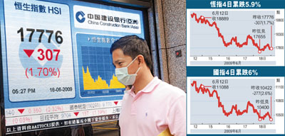 中新網(wǎng)6月19日電 據(jù)香港《文匯報(bào)》報(bào)道,港股連續(xù)第4個(gè)交易日下跌,恒指18日剛開市便急挫,失守18000點(diǎn)大關(guān)后,瞬即落至全日最低位17655點(diǎn),連17700點(diǎn)也守不住,午后跌幅雖一度收窄,但臨收市沽壓又再度重現(xiàn),全日收?qǐng)?bào)17776.6點(diǎn),跌307.9點(diǎn),成交額639億元。