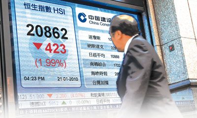 在內(nèi)地公布去年第四季經(jīng)濟數(shù)據(jù)后,大市氣氛逆轉。在匯控、中移動及富士康等藍籌領跌之下,地產(chǎn)股跌幅擴大,中資金融股也全線下滑,令一度收復21日早失地的港股,午后再急瀉,曾低見20828點,跌近460點。恒指全日收報20862.6點,跌幅達2%,為3個月以來的低位,成交額835.9億元,顯示沽壓強大。