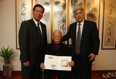 陳進玉代為轉(zhuǎn)交這份千里之外的濃濃祝福,饒老接在手中,凝神細望,若有所思,笑得開懷:“虎年,好年”。陳進玉轉(zhuǎn)達了溫總理的新春問候。他說,饒宗頤先生為弘揚中華民族優(yōu)秀傳統(tǒng)文化、促進國家文化建設(shè)提出了許多寶貴意見。去年初饒老獲溫總聘任,擔(dān)任中央文史研究館館員,當(dāng)?shù)弥埨媳M管年事已高,仍關(guān)注國家文化建設(shè)時,溫總深受感動,也十分關(guān)心饒老的健康和生活,百忙之中,仍將饒老安康緊系心頭。