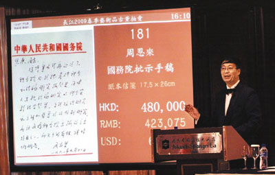 中新網(wǎng)5月25日電 據(jù)香港《文匯報(bào)》報(bào)道,長(zhǎng)江2009春季藝術(shù)品、古董拍賣(mài)會(huì)24日首次在香港展開(kāi),近400件珍品成功售出,總成交額高達(dá)1.3億元。拍賣(mài)品中包括珍貴的已故國(guó)務(wù)院總理周恩來(lái)親手批核的國(guó)務(wù)院批示手稿,24日以48萬(wàn)元高價(jià)成交。