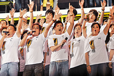沒人歡呼,沒人揮動熒光棒,萬人聚集在一起,并不是欣賞精彩表演,為的只是告訴臺灣受臺風(fēng)吹襲的災(zāi)民,他們在困境中并不孤獨;為的只是從心中呼喊一聲:“臺灣加油!”