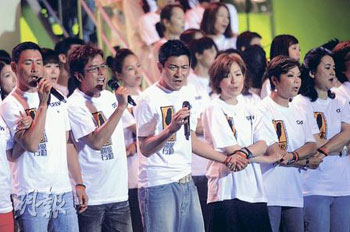 嫁給臺灣富商鄭翔中后,移居當(dāng)?shù)?3年的前港姐李美鳳,不單捐出一對子女的利是錢,更即場除下手上的價值10多萬的鉆石表義賣。愛心是無價的,所以她不設(shè)底價。鄭秀文與劉德華合唱《喝彩》,她說:“天災(zāi)無法避免,人類好渺小,要正面態(tài)度去面對,要帶著勇氣活下去,黑暗過后一定有陽光!”還有藝人狄波拉、陳奕迅、方力申、劉璇等,也充當(dāng)接線生出力籌款。
